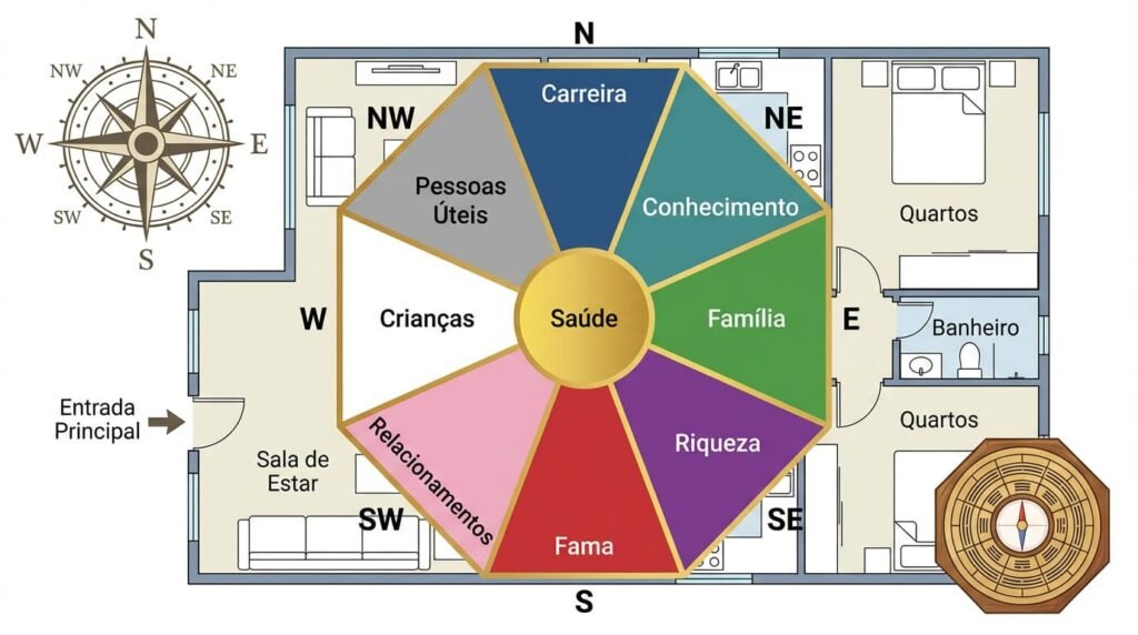 O Mapa Baguá é a ferramenta mais importante do Feng Shui, um verdadeiro mapa do tesouro para a harmonização energética do seu lar. Se você já ouviu falar em Feng Shui, mas não sabe por onde começar, entender o Mapa Baguá é o primeiro passo para transformar sua casa em um santuário de bem-estar e prosperidade. Neste guia, vamos desvendar os segredos do Mapa Baguá, explicando o que é, como aplicá-lo e como ativar cada uma das suas 9 áreas para uma vida mais equilibrada e feliz.