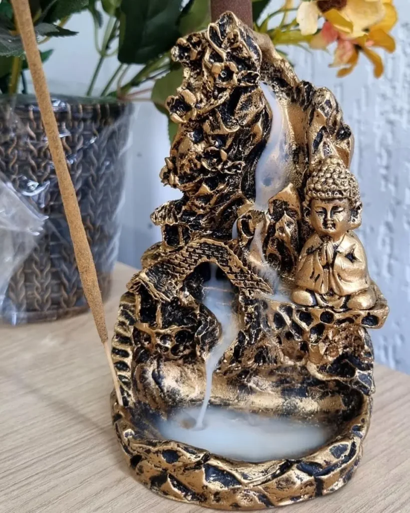 Com um design imponente de montanha e um Buda orando em dourado, esta peça é perfeita para quem busca um elemento espiritual forte. Além do visual, ele é extremamente funcional, servindo tanto para cones de cascata quanto para incensos de vareta. Com 520 gramas, é o modelo mais pesado e estável da lista.